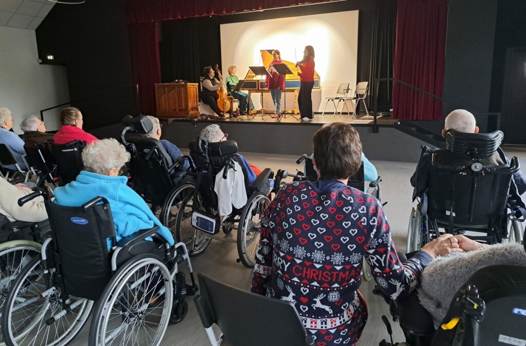 Un moment tout simplement magique : les musiciennes ont interprété les œuvres travaillées dans la journée, offrant un véritable voyage hors du temps. Résidents, professionnels et aidants se sont laissés porter par ces sonorités délicates 🎶, magnifiquement sublimées par la voix envoûtante d’une soprano 🎤.